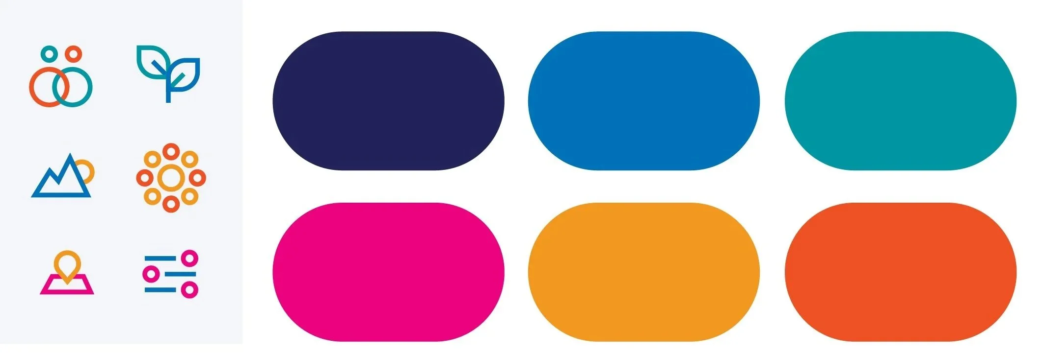 Stemming from the logo is a broader visual identity system consisting of a color palette, typography styles, graphic language, and more were created to help communicate on behalf of the brand. An icon system was designed to emulate the shapes within the logo and help convey the six critical factors, which are pillars of this collaborative. The rounded shapes in the design system emulate the shapes within the logo as well, making everything feel cohesive and simple to execute.