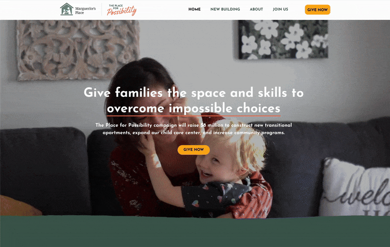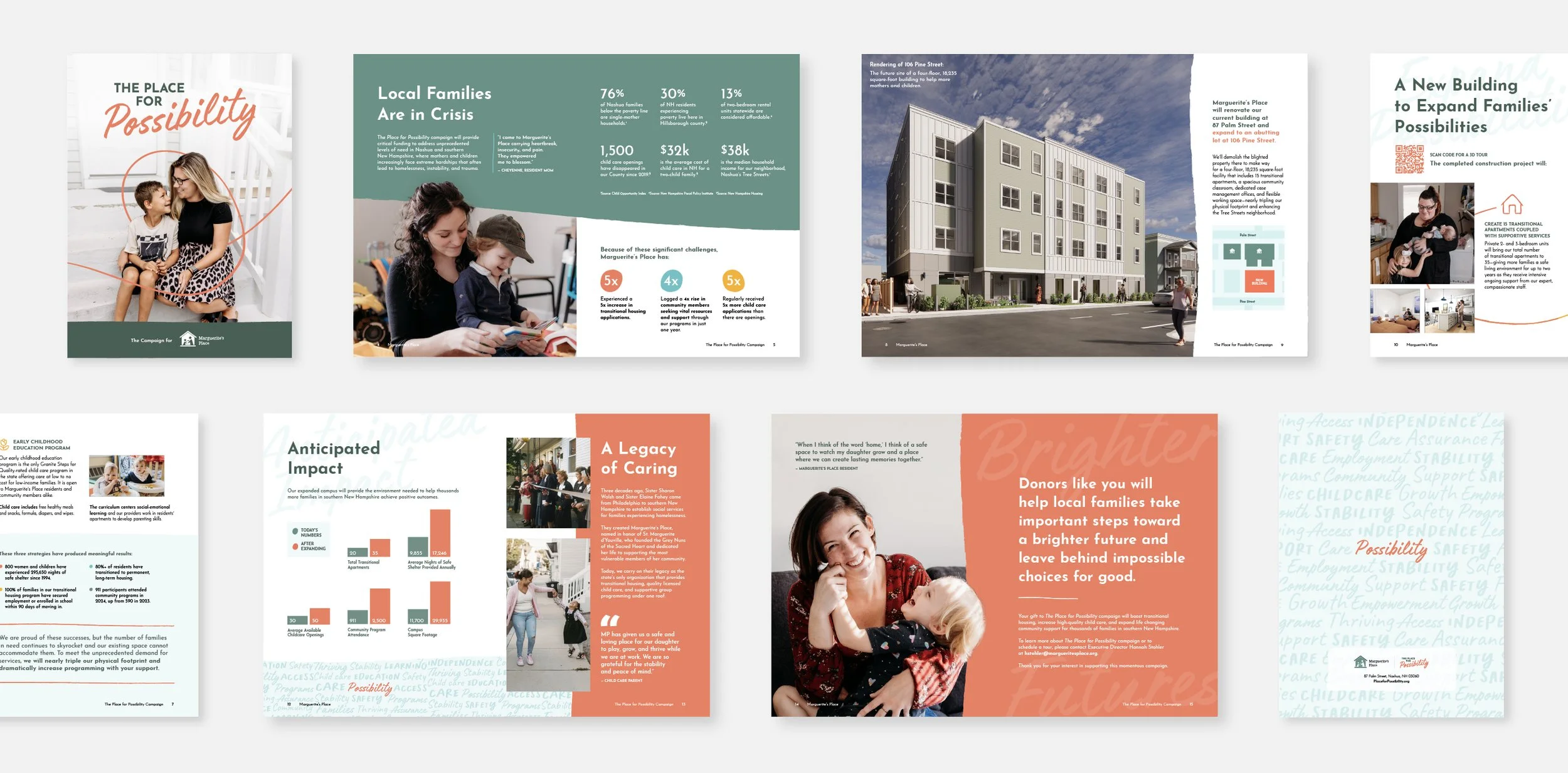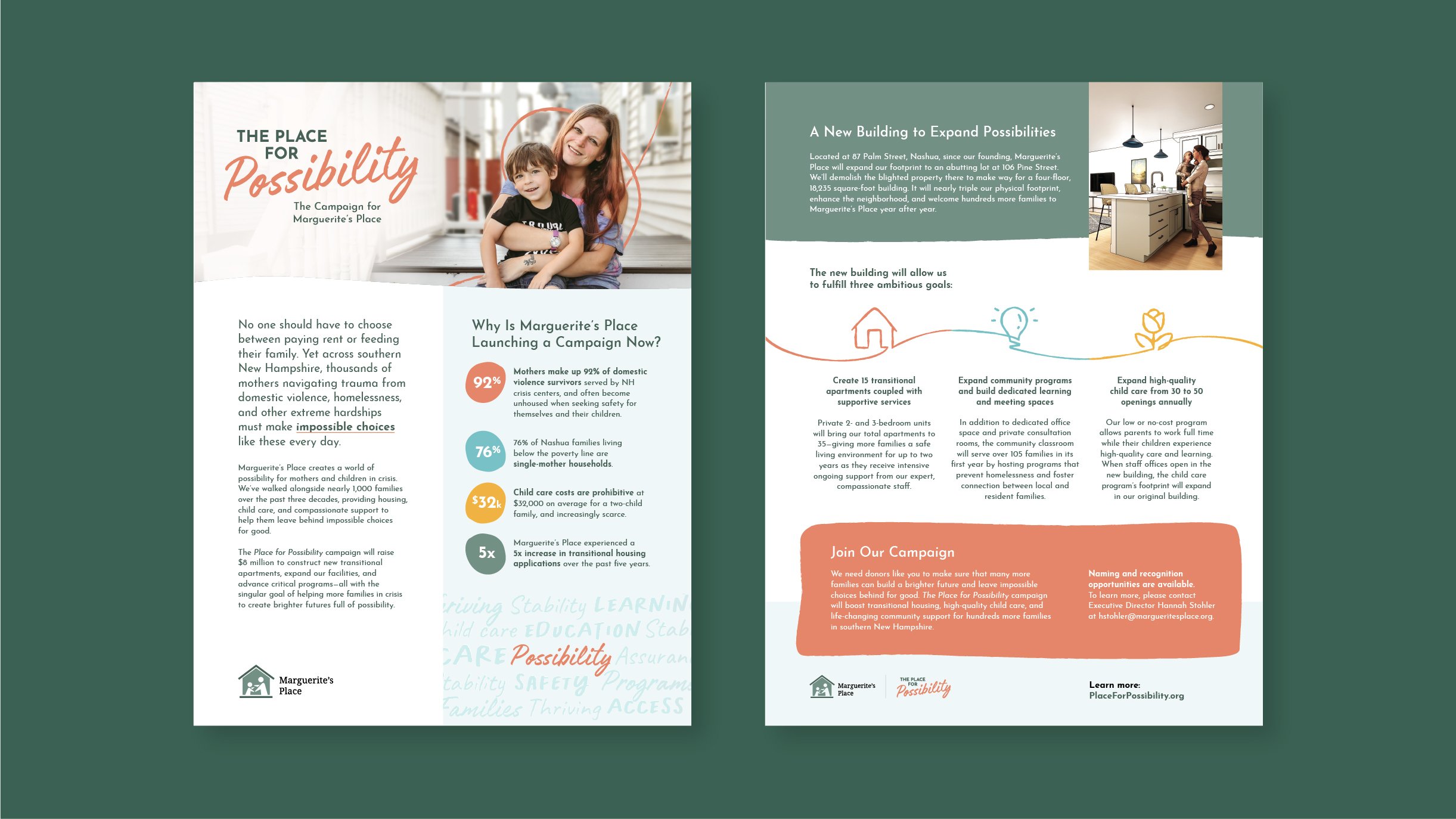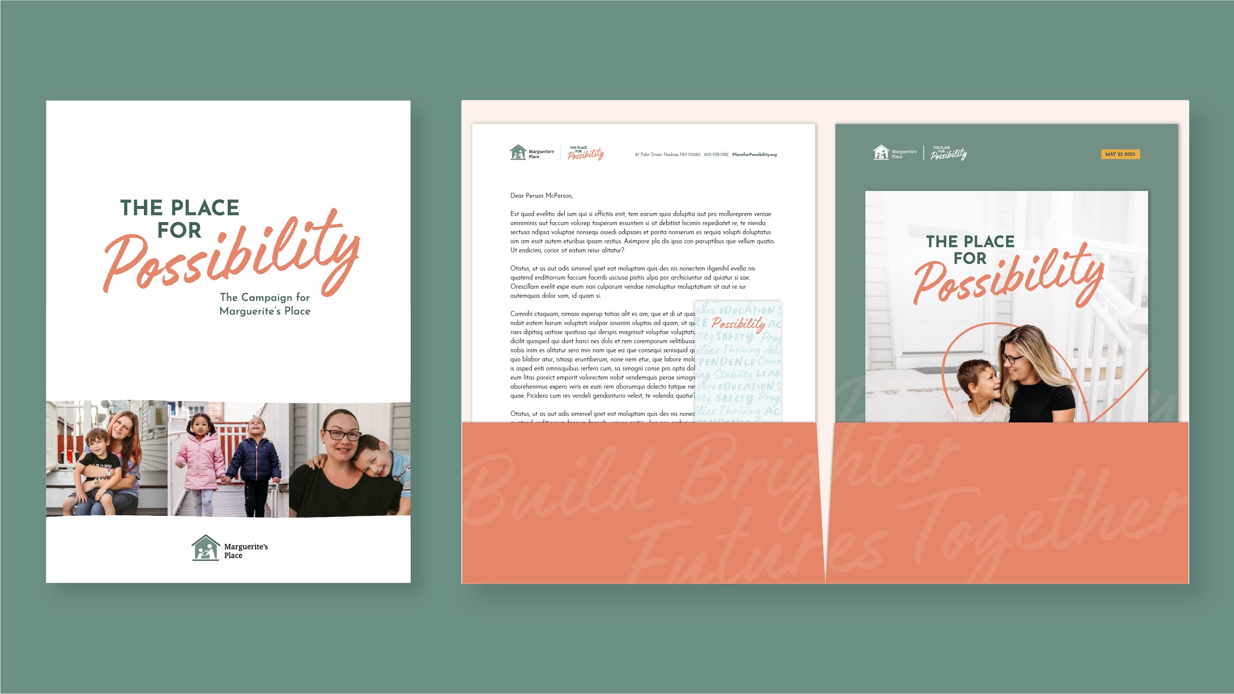 Marguerite’s Place is a nonprofit that supports families on their path to safety, stability, and independence through transitional housing for women and children, early childhood education, and holistic, community-based programs. They reached out seeking visual identity and design exploration for their capital campaign.
